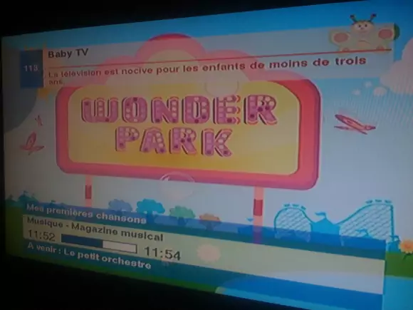 Le message d’avertissement "La télévision est nocive pour les enfants de moins de trois ans" est visible sur la chaîne Baby TV (canal 113 de Freebox TV) :
