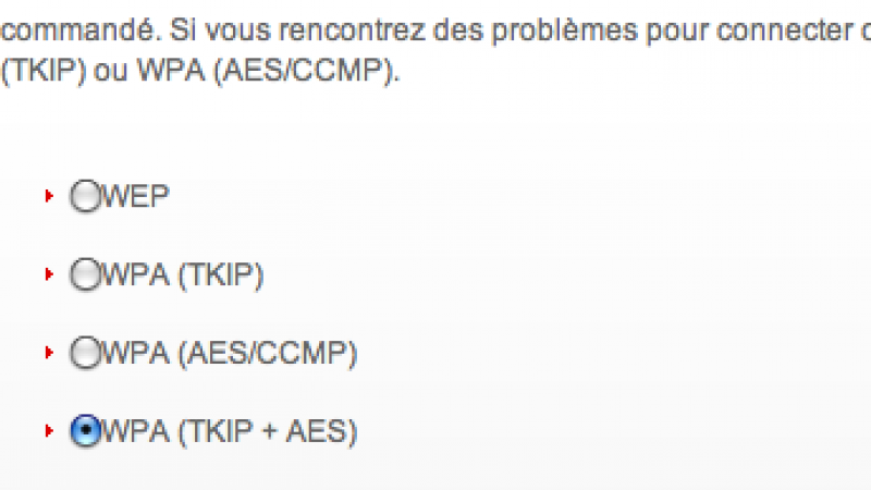 Nous vous recommandons, quoi qu’il en soit, si vous avez activé le WIFI dans votre console de gestion, de privilégier la protection WPA (TKIP + AES).