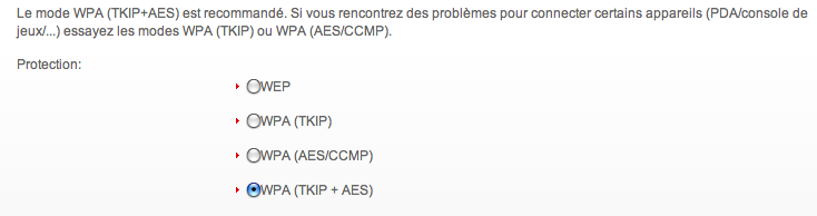 Nous vous recommandons, quoi qu’il en soit, si vous avez activé le WIFI dans votre console de gestion, de privilégier la protection WPA (TKIP + AES).