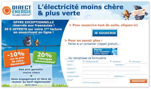 "Freenautes, économisez aussi sur votre facture d’électricité avec Direct Energie. Grâce à Free, Vous avez économisé sur votre facture de Télécoms ! Soyez aussi malin avec l’électricité !"