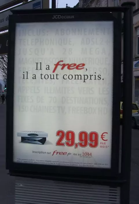 Clin d’oeil : Parallèlement à sa diffusion dans les postes de télévision, la nouvelle campagne publicitaire de Free se propage également dans la rue. Elle arbore les couleurs et le slogan des derniers spots publicitaires avec Rodolphe : Il a Free, il a tout compris.