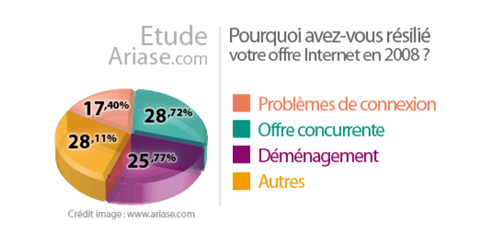 Ariase publie aujourd’hui son observatoire des résiliations 2008. Cette étude est rendue possible grâce au générateur de lettres de résiliations d’Ariase, qui lui permet de collecter, de façon anonyme, les causes de la résiliation ainsi que le futur FAI choisi.