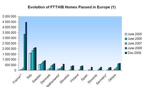 La France se retrouve ainsi à la 3ème place européenne au niveau des abonnements à une offre FTTH/FTTB, avec moins de 200 000 abonnés, loin derrière la Suède (400 000) et l’Italie (plus de 300 000).