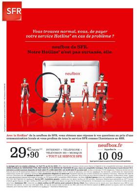Comme l’annonce notre confrère Cercle9, SFR vient de lancer une nouvelle campagne de pub dans la presse, et vise Free en particulier. Sur l’une d’elle, est inscrit « Vous trouvez normal, vous, de payer votre service Hotline en cas de problème ? ». Avec comme sous-titre : « Notre Hotline n’est jamais surtaxée, elle. ».