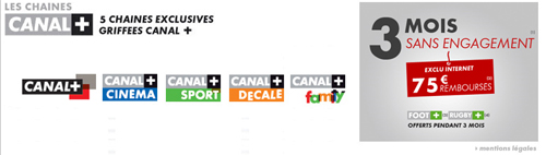 3 mois sans engagement avec Foot+ et Rugby+ offerts durant 3 mois (frais d’accès de 40€ en sus). A l’issue de vos 3 mois d’essais, si vous souhaitez garder votre abonnement, Canal+ vous remboursera 75€ à valoir sur vos prochaines factures.