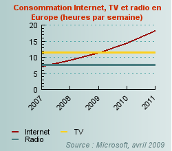 Depuis plus d’un an, les Européens surfent sur le Web davantage qu’ils n’écoutent la radio, selon une étude de Microsoft. Et le Web devrait dépasser la télévision en juin 2010, selon ces projections. A cette date, le temps passé en ligne atteindrait en moyenne environ 14,2 heures par semaine contre 11,5 pour la TV.