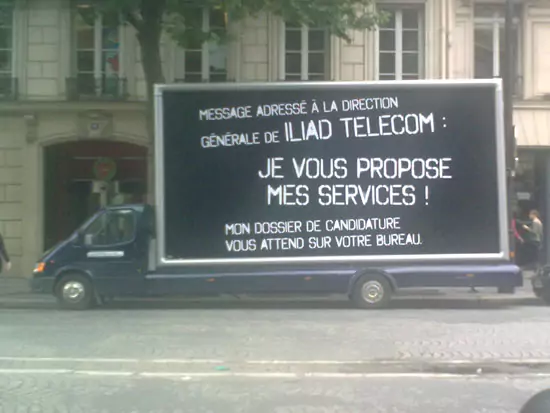Crise de l’emploi oblige, les demandeurs d’emplois redoublent d’imagination pour se faire remarquer par les entreprises. C’est donc le cas de cette personne dont le camion était stationné Boulevard Malesherbes à Paris. Nous ne savons pas pour le moment si son initiative a été couronnée de succès.