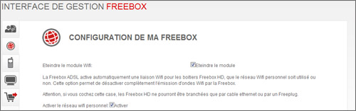 Si vous souhaitez activer cette option, rendez-vous sur votre interface de gestion, dans la rubrique Internet > Configurer mon réseau Wifi Freebox, puis cocher la case « éteindre le module ». Une fois validée cette modification, il vous faudra redémarrer votre Freebox ADSL pour que les nouveaux paramètres soient pris en compte.
