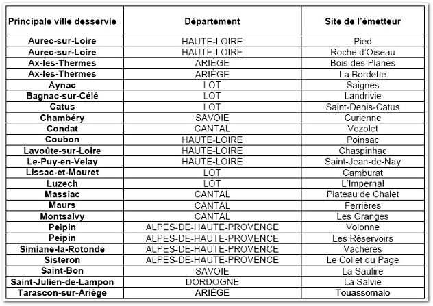 42 émetteurs numériques ont été mis en service le 30 avril 2009 :