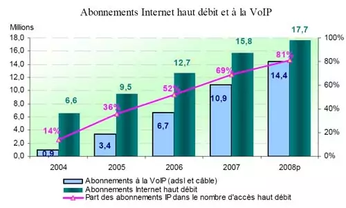 2008, dont 26,3 millions sont des abonnements en téléphonie classique et 14,4 millions sont des abonnements à la voix sur large bande. Le volume d’abonnements s’est accru de 2,5% sur un an, soit un million d’abonnements supplémentaires, grâce à la croissance du nombre d’abonnements en IP (+3,5 millions) qui a plus que compensé la baisse du nombre d’abonnements en bas débit (-2,4 millions). Fin 2008, la voix sur IP est souscrite par 81% des abonnés à Internet par le haut débit, contre 69% un an plus tôt.