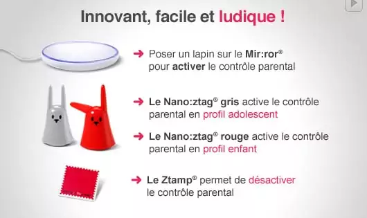 Le Pack FreeAngel RFID et donc depuis ce soir disponible dans la boutique Free. Si vous souhaitez le commander, rendez-vous sur votre espace de gestion Freebox et allez dans la boutique en ligne. Le pack FreeAngel RFID est proposé au tarif de 49,90€, et sera directement prélevé par Free sur votre prochaine facture. Il contient un mir :ror, 2 nano :ztag (minis lapins renfermant une puce RFID) préconfigurés en mode enfant et adolescent, une puce RFID autocollante pour désactiver le contrôle parental et 3 puces RFID supplémentaires.