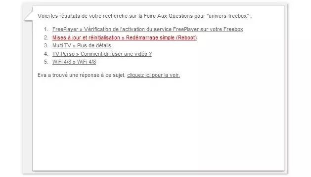 Eva est la conseillère particulière (virtuelle) des Freenautes. Et elle ne connait pas la crise Eva. Elle est disponible 24 heures sur 24 depuis le site de l’assistance. Elle répond à toutes les questions concernant l’offre Freebox. Les réponses sont souvent formulées par Eva sous forme de tutoriels. Pour l’interroger, il suffit de cliquer sur Eva dans la colonne de droite du site de l’assistance.