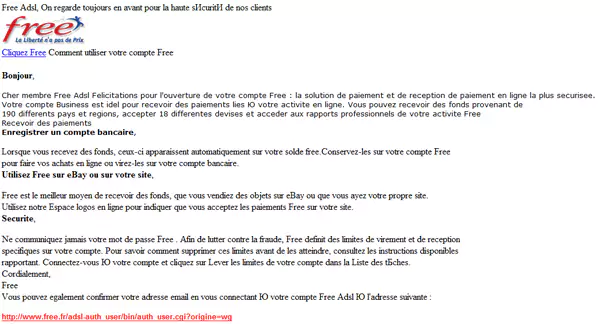 Habituellement plutôt bien faits, si l’on excepte les fautes d’orthographe, les mails envoyés pour attirer les freenautes sur ce faux site prétextent d’un problème de sécurité ou encore de la mise à jour de vos coordonnées bancaires.