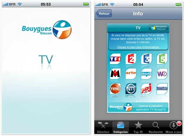 Après Orange et SFR, c’est au tour de Bouygues Telecom de proposer une application pour visualiser la télévision sur iPhone. L’application nommée « TV Bouygues Telecom » est disponible gratuitement dans l’AppStore d’Apple. Une fois téléchargée, il suffit de cliquer sur l’icône « TV BouygTel » disponible sur l’écran d’accueil de l’iPhone et de choisir l’une des chaînes proposées (TF1, France 2, France 3, France 5, M6, Direct8, Arte, W9, TMC, NT1, Nrj12, LCP…).