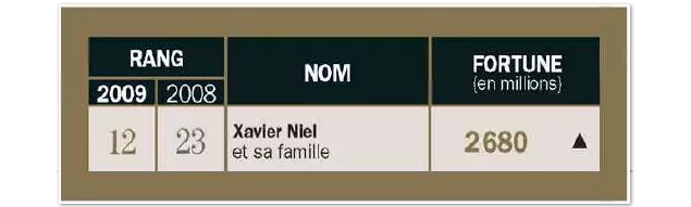Le magazine Challenges a publié le classement des 500 plus grandes fortunes professionnelles de France. Xavier Niel, actionnaire majoritaire et fondateur d’Iliad (Free-Alice) se classe en 12ème position avec 2680 Millions d’euros. Il était 23ème en 2008. Dans ce classement, on retrouve notamment Martin et Olivier Bouygues en 21ème position (avec 1948 millions d’euros). Les deux frères possèdent environ 19% du groupe Bouygues (CA : 32,7 milliards), "qui souffre de la crise de l’immobilier et de la chute des recettes de TF1".