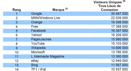 On remarquera cependant l’entrée dans ce classement, à la 13ème place, du nouveau moteur de recherche de Microsoft, Bing, qui avec 11 567 000 visiteurs uniques, dispose déjà du tiers de l’audience de Google