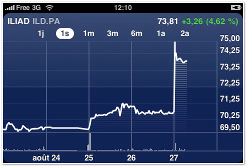 Les marchés financiers ont accueilli sereinement l’annonce des résultats semestriels en hausse d’Iliad (finalement, supérieurs aux attentes de certains analystes qui prévoyaient une baisse des résultats de 18%) et la confirmation des objectifs pour 2009. A l’heure actuelle, le titre du groupe Iliad grimpe de + 4,62% (73,81 euros). Le CAC 40 progresse quant à lui timidement de + 0,07% (3670,91 points).