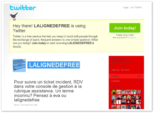Les abonnés peuvent ainsi poser des questions et/ou retrouver plusieurs conseils pratiques (concernant la Freebox, la ligne ADSL, etc…) directement depuis l’espace Twitter @LaLignedeFree. On peut notamment lire dans l’univers Free : "Pour suivre un ticket incident, RDV dans votre console de gestion à la rubrique assistance. Un terme inconnu ? Pensez à eva ou @lalignedefree".