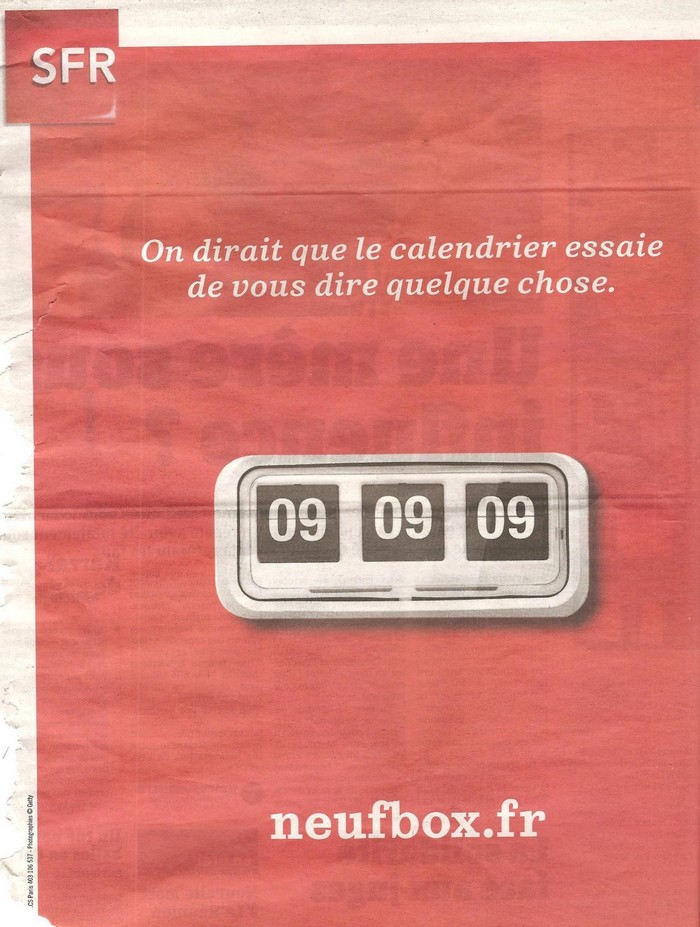 C’est à la date du Mercredi 09/09/09 qu’SFR a eu l’originalité de sortir dans la presse une publicité simplissime se concentrant sur le chiffre 9. A défaut de proposer la cagnotte des 9 millions d’Euros du Loto, SFR a décidé de célébrer cette journée à sa manière, dont voici l’affiche :