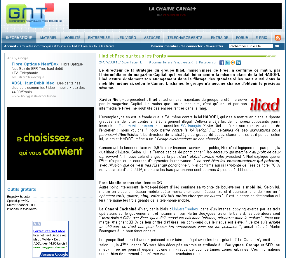 Le directeur de la stratégie du groupe Iliad, maison-mère de Free, a confirmé ce matin, par l’intermédiaire du magazine Capital, qu’il voulait lutter contre la mise en place de la loi HADOPI. Iliad assure également son engagement dans le fibrage des grandes villes mais aussi dans la mobilité, même si, selon le Canard Enchainé, le groupe n’a aucune chance d’obtenir le précieux sésame.