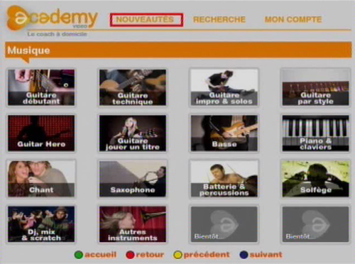 Nous vous annoncions la semaine dernière l’arrivée du service VOD de SVOD Academy Vidéo. Il est disponible depuis cet après midi sur le canal 103 de Freebox TV. Sur le même principe que Vodéo, Academy Vidéo permet de consommer des vidéos à la demande, soit à l’unité, soit de façon illimité par abonnement. 8 chaînes thématiques sont disponibles : Fitness et santé, Cuisine, Sports, Passions, Danse, Cours de musique, Chasse et pèche, Formation. Toutes dispensent des cours ou d’être coaché, permettant ainsi d’apprendre de nouvelles activités sans sortir de chez soi.