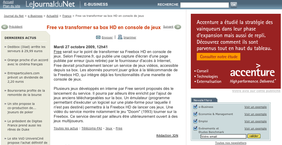 Free serait sur le point de transformer sa Freebox HD en console de jeux. Selon Freezone.fr, qui publie une capture d’écran d’une page publiée par erreur (puis retirée) par le fournisseur d’accès à Internet, Free devrait prochainement lancer un service de jeux vidéos, accessible depuis sa box.