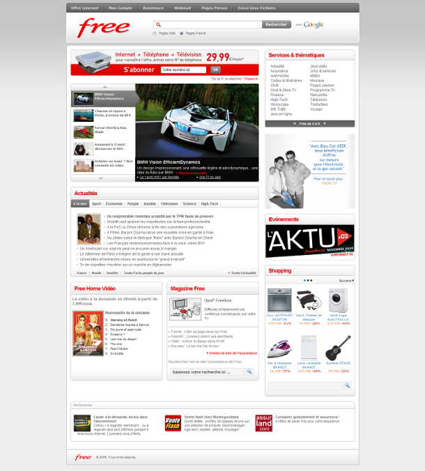 La page d’accueil du portail Free.fr s’est offert un petit lifting. C’est principalement, le design et la disposition des rubriques qui ont changé. Le nouveau portail est composé des différentes rubriques traditionnellement proposées par Free : Services et thématiques (assurances, météo,…), l’actualité (nationale, internationale, sport, people…), des conseils sur l’utilisation des services Freebox ainsi qu’un moteur de recherche pour naviguer directement dans les rubriques de l’assistance.