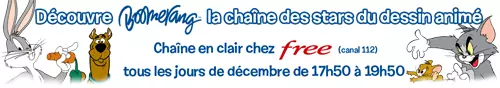 La chaîne Boomerang nous informe qu’a compter du mardi 1er décembre, et jusqu’au 31, elle met en place une opération "spécial Noel" en collaboration avec Free. Tout d’abord Boomerang sera accessible gratuitement, tous les jours de décembre de 17h50 à 19h50 sur le canal 112 de Freebox TV (diffusion des séries Hello Kitty et ses Amis, Zorori, Master Hamsters et L’Heure des Looney Tunes).