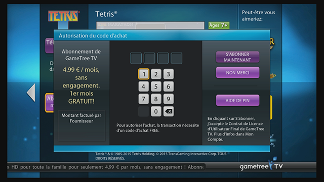Tetris est disponible depuis l’application GameTree TV de la Freebox Révolution, il vous en coûtera 4€99 par mois pour un accès à Tetris ainsi qu’à plus de 50 jeux en illimité. Mais le premier mois étant gratuit vous pouvez en profiter durant cette période et ensuite résilier l’abonnement au jeu à la fin de ce dernier.