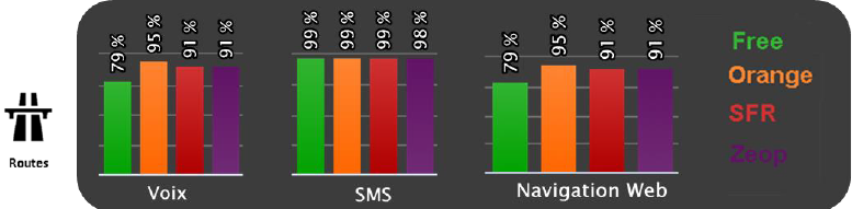 Sur les routes, la qualité des appels mesurée position Free à la dernière place avec 79% des appels maintenus pendant 2 minutes, en ce qui concerne les sms, Free est cette fois-ci ex aequo à la première place avec Orange et SFR.