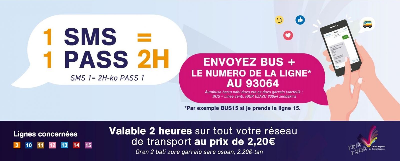 Depuis le 29 juin, un simple SMS suffit à remplacer un ticket de bus sur plusieurs réseaux du Pays Basque. Pour cela, il suffit d’envoyer le code BUS suivi du numéro de la ligne au 93 064. Le titre de transport sera alors directement reçu par l’usager sur son mobile, ne restera plus qu’à le présenter au chauffeur.