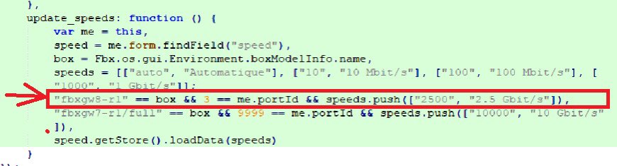 Après avoir réussi à se procurer “par le biais d’une tierce personne le firmware bêta de la Freebox Révolution en version 4.2” nous indique-t-il, ce dénicheur a ensuite scanné le fichier javascript en le comparant à l’actuel. Une recherche fructueuse, puisque dans les lignes de code est apparu la Freebox Pop dont le nom de code en interne est “fbxgw8”. A y regarder de plus près, le débit max de la nouvelle box intermédiaire de l’opérateur y est inscrit. Free prévoit ainsi de proposer des débits allant jusqu’à 2,5 Gbits/s contre 1 Gbit/s pour la mini 4K, One et Révolution et 10 Gbits/s pour la Freebox Delta. De quoi frapper fort lors de la commercialisation de son nouveau bébé, la concurrence ne proposant qu’au mieux des débits de 2 Gbits/s partagés.