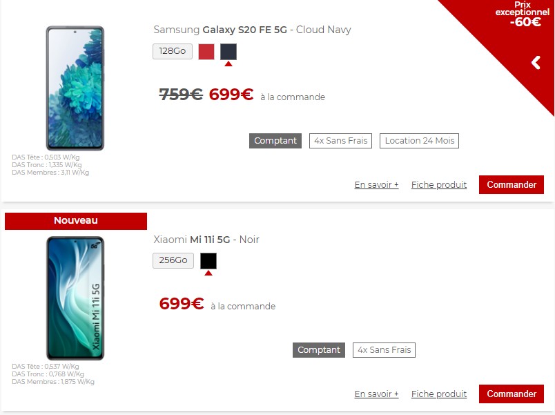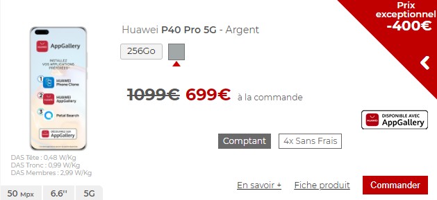 Le Huawei P40 Pro 5G en capacité 256 Go et coloris argent est en effet vendu à 699 euros, au lieu de 1 099 euros, grâce à une ristourne de 400 euros. Le smartphone peut également être acquis en 4 fois sans frais, avec un premier versement de 201 euros à la commande, puis trois versements de 166 euros.