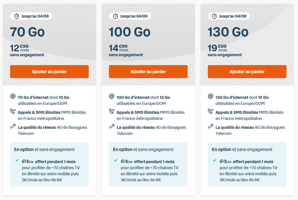 Jusqu’au 4 août 2021, Bouygues Telecom commercialise trois forfaits 4G B&You 70 Go à 12,99 euros par mois, 100 Go à 14,99 euros par mois et 130 Go à 19,99 euros par mois. Là encore, appels, SMS et MMS sont illimités. Déduite de l’enveloppe globale, une enveloppe de 10 à 15 Go (selon le forfait) est utilisable depuis l’Europe et les DOM. À noter enfin l’option b.TV, permettant de regarder plus de 70 chaînes depuis le mobile, qui est offerte pendant un mois avant de coûter 3 euros (au lieu de 6).